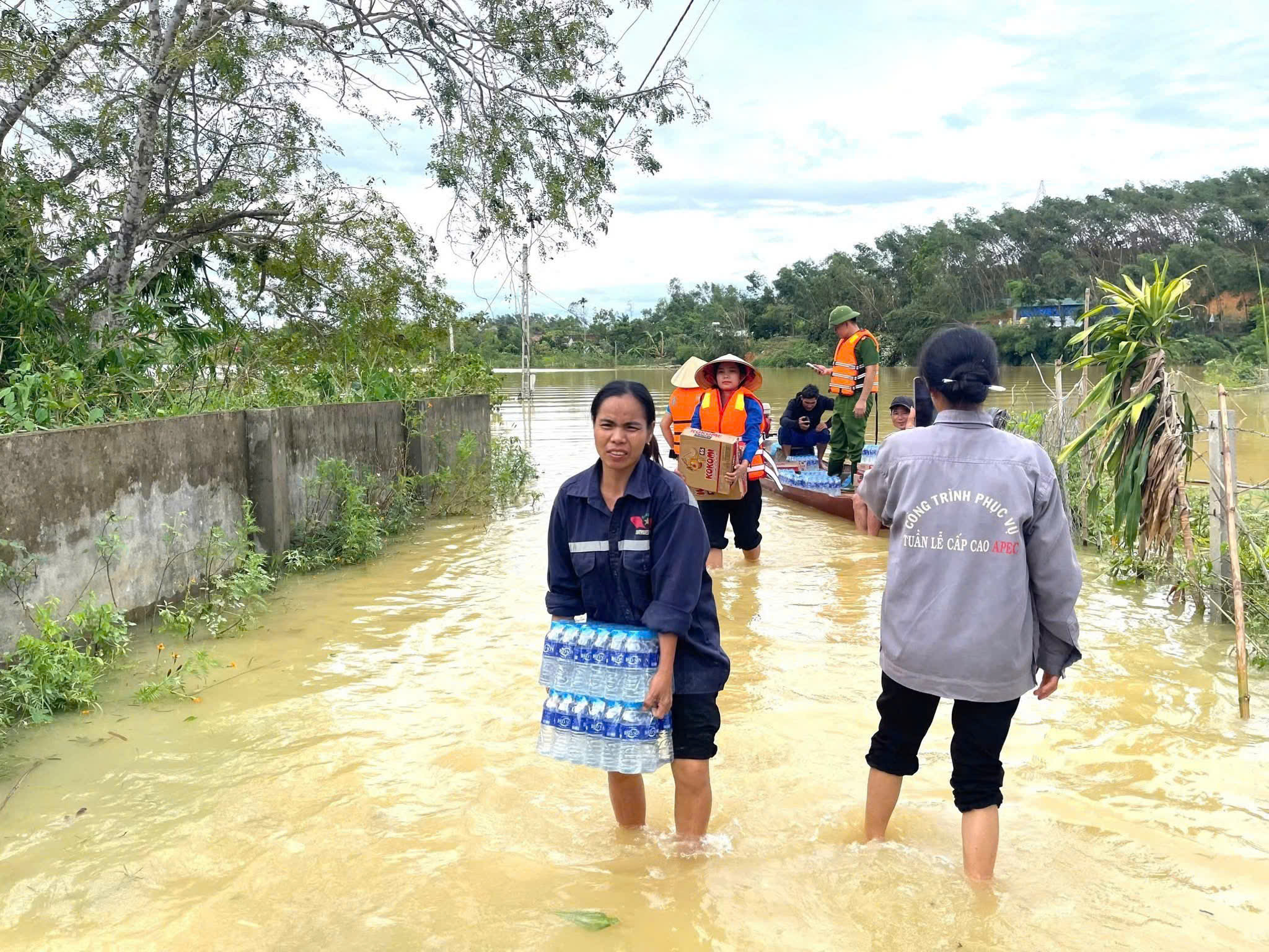 Đoàn cứu trợ di chuyển qua các khu vực ngập nước để trao tận tay bà con những chai nước và thùng mì tôm.