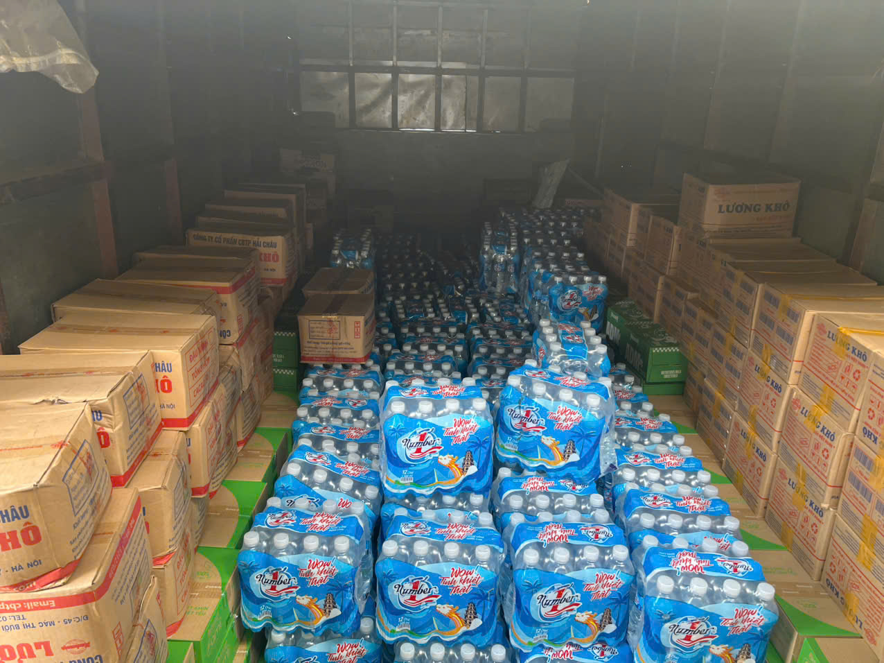 Đoàn xe của Amavet chở theo hàng trăm thùng nước uống, sữa, mì tôm, lương khô cùng nhiều vật phẩm cần thiết đã trực tiếp đến các điểm tiếp nhận hỗ trợ của hai xã.