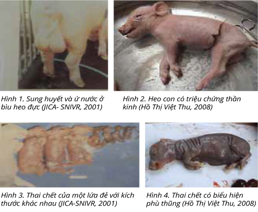 Tất cả heo trưởng thành, heo nái mang thai đều không có triệu chứng bệnh. Tuy nhiên, gần đây triệu chứng thần kinh cũng được ghi nhận từ các heo giống trưởng thành ngoại nhập. Các ảnh hưởng bệnh lý trên các heo cái mang thai được ghi nhận qua những dấu hiệu bất thường của lứa đẻ. Trong lứa đẻ có nhiều thai khô, thai chết, heo con yếu ớt với triệu chứng thần kinh như run, co giật (hình 2) và chết sau vài ngày. Thai của một lứa đẻ thường có kích thước khác nhau (hình 3), thai chết có biểu hiện phù thũng (hình 4) Hiện tượng sẩy thai ít được ghi nhận trong các nghiên cứu gây bệnh thực nghiệm (Chu và Joo, 1996).