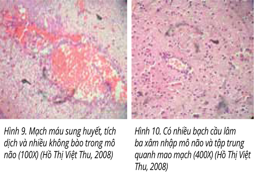 Bệnh tích vi thể quan trọng chủ yếu ở hệ thần kinhtrung ương đặc trưng bởi hiện tượng viêm não không mủ, tích dịch (Hình 9), có nhiều bạch cầu tập trung quanh mạch (hình 10), biến đổi bệnh lý chủ yếu được tìm thấy hệ thống lưới nội mô, nhiều điểm tăng sinh ở vùng tủy lách và viêm tổ chức kẽ ở phổi (Johnson, 1987).