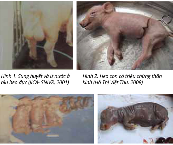 Tất cả heo trưởng thành, heo nái mang thai đều không có triệu chứng bệnh. Tuy nhiên, gần đây triệu chứng thần kinh cũng được ghi nhận từ các heo giống trưởng thành ngoại nhập. Các ảnh hưởng bệnh lý trên các heo cái mang thai được ghi nhận qua những dấu hiệu bất thường của lứa đẻ. Trong lứa đẻ có nhiều thai khô, thai chết, heo con yếu ớt với triệu chứng thần kinh như run, co giật (hình 2) và chết sau vài ngày. Thai của một lứa đẻ thường có kích thước khác nhau (hình 3), thai chết có biểu hiện phù thũng (hình 4). Hiện tượng sẩy thai ít được ghi nhận trong các nghiên cứu gây bệnh thực nghiệm (Chu và Joo, 1996).