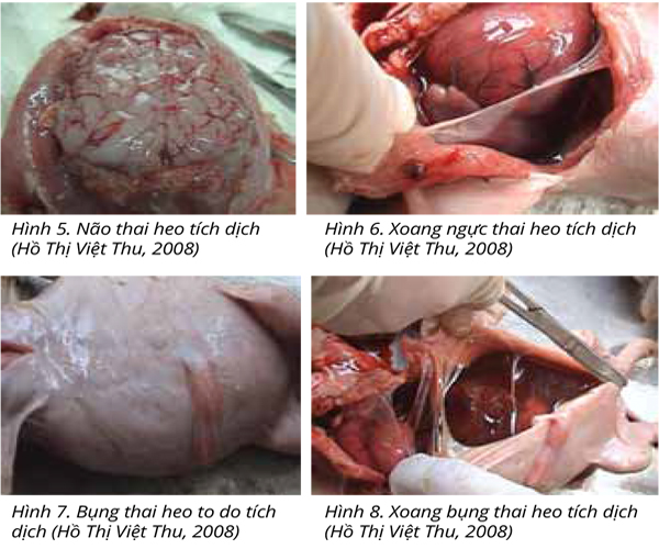 Bệnh tích không được ghi nhận ở heo nái bị nhiễm bệnh sau khi đẻ. Tuy nhiên, bệnh lý được ghi nhận chủ yếu là những bất thường của lứa đẻ từ những heo nái bị nhiễm vi-rút trong thời gian mang thai. Bệnh tích đại thể đáng chú ý là thai chết hoặc heo con sinh ra yếu ớt do viêm não tích dịch (hình 5), phù thũng ở da, tích nước xoang ngực (hình 6), xoang bụng (hình 7, hình 8), xuất huyết ở tương mạc, hạch lâm ba sung huyết, hoại tử ở gan và lách, sung huyết ở màng não và tủy sống (Burn, 1950). Nếu quan sát kỹ có thể thấy hệ thần kinh trung ương giảm sản ở một số vùng với biểu hiện võ não cực mỏng ở những heo con bị viêm não tích dịch (Shimizu và cộng sự, 1954). Ở heo nọc, dịch hoàn viêm, có nhiều dịch nhầy ở màng bao dịch hoàn, đồng thời có lớp fibrin dày ở mào tinh cũng như màng trong của bao dịch hoàn.