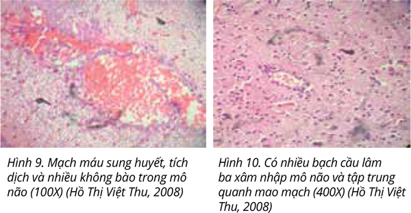 Bệnh tích vi thể quan trọng chủ yếu ở hệ thần kinh trung ương đặc trưng bởi hiện tượng viêm não không mủ, tích dịch (Hình 9), có nhiều bạch cầu tập trung quanh mạch (hình 10), biến đổi bệnh lý chủ yếu được tìm thấy hệ thống lưới nội mô, nhiều điểm tăng sinh ở vùng tủy lách và viêm tổ chức kẽ ở phổi(Johnson, 1987).