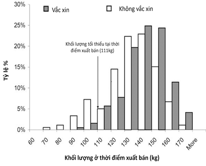 Thời gian nuôi tới xuất chuồng ở nhóm đối chứng và nhóm vắc xin không có sự khác biệt, trung bình khoảng 194 ngày. Khác biệt thể hiện ở khối lượng xuất chuồng của nhóm đối chứng (trung bình 124,1 – 127,7 kg) thấp hơn rõ rệt so với nhóm vắc xin (trung bình 133,1 – 136,3 kg). Đặc biệt, nhóm vắc xin không có cá thể nào có khối lượng < 90 kg tại thời điểm xuất bán (Horlen et al., 2008).