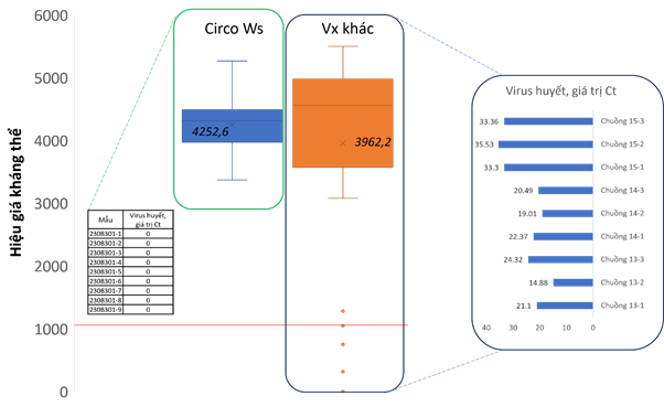 Đáp ứng miễn dịch hình thành sau tiêm vắc xin circo dẫn tới ức chế sự nhân lên của PCV2, làm giảm tải lượng virus trong máu xuống dưới ngưỡng gây bệnh. Đây cũng là một chỉ tiêu dùng để so sánh hiệu quả giữa vắc xin circo Ws với các vắc xin circo khác. Đánh giá được thực hiện với những trại dương tính PCV2 trước tiêm.